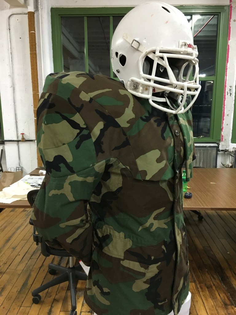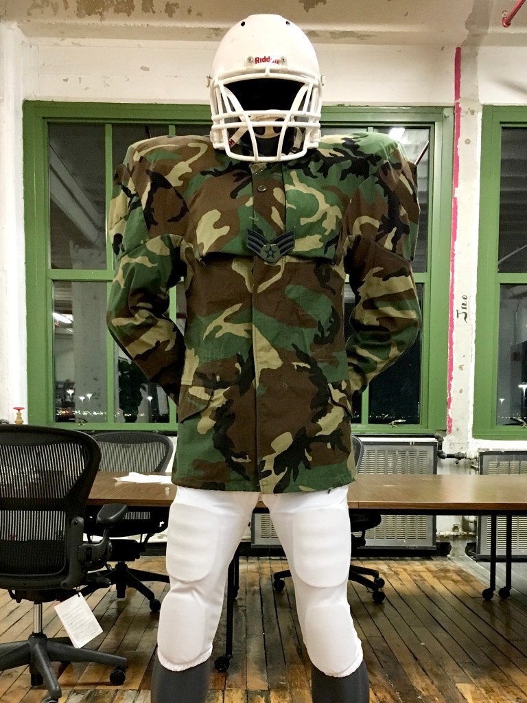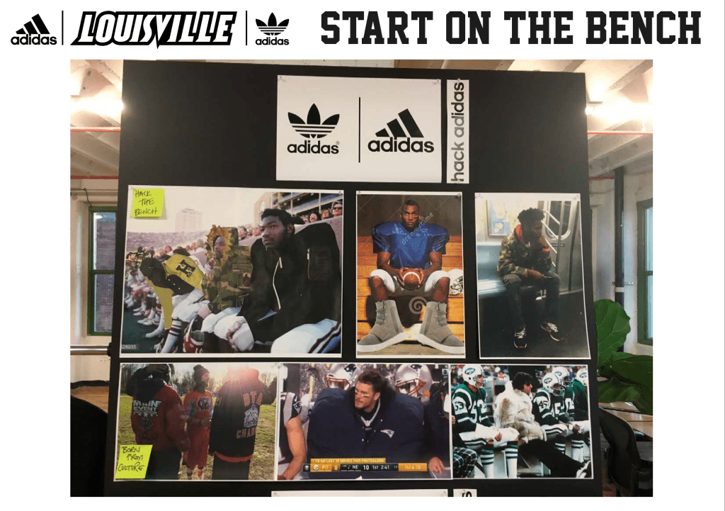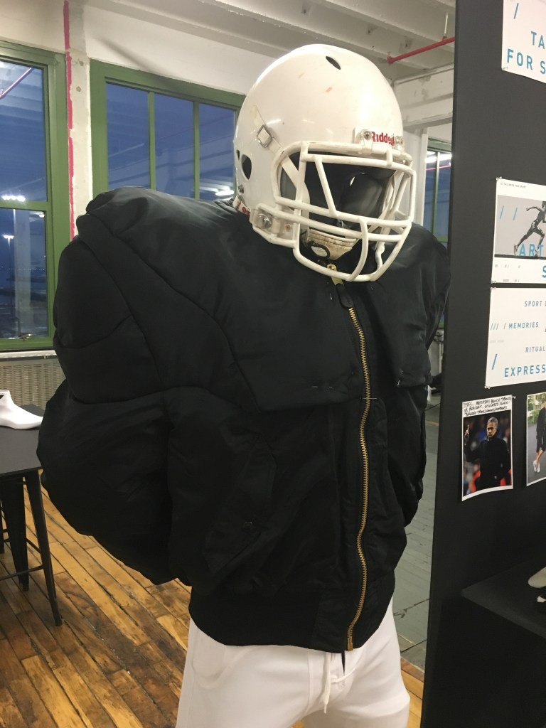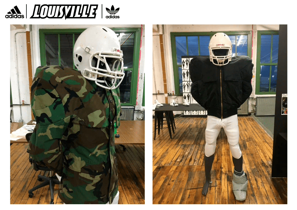 The NFL sideline project was inspired by an image I found of Joe Namath, sat on the sideline with his team mates, whilst out injured and wearing his fur coat. It got me thinking that the sidelines offered a great opportunity to showcase lifestyle products for any company sponsoring the team. I chose to create two military jackets (field jacket, MA1 bomber) for their strong identity and affiliation with streetwear and further customized the project for the Adidas sponsored college team, Louisville.