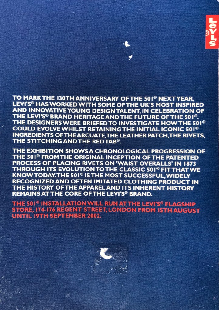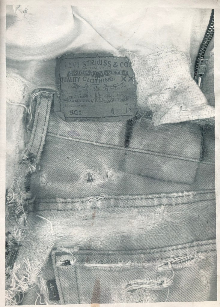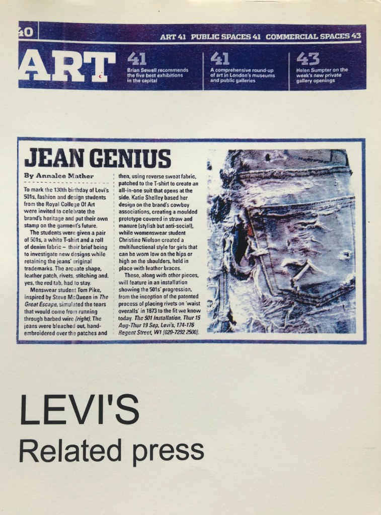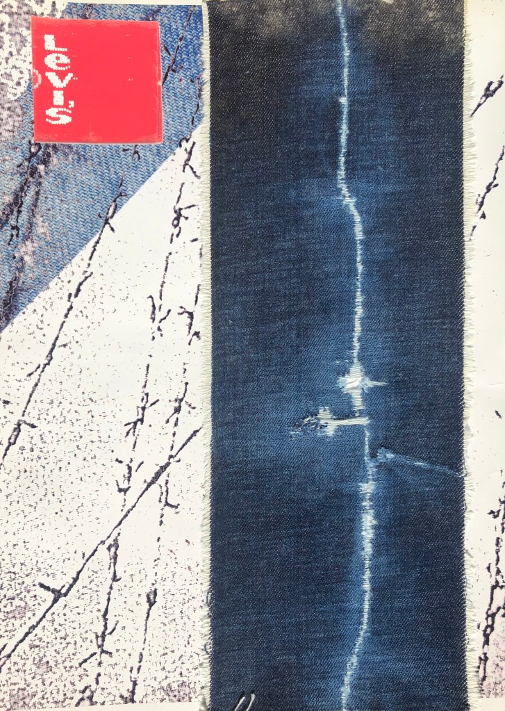 Responding to a brief set by Levi’s, where we were given a plain white T-shirt and a pair of raw denim 501’s, I recreated an old pair of Levis 501’s that I had lovingly worn for 7 years.