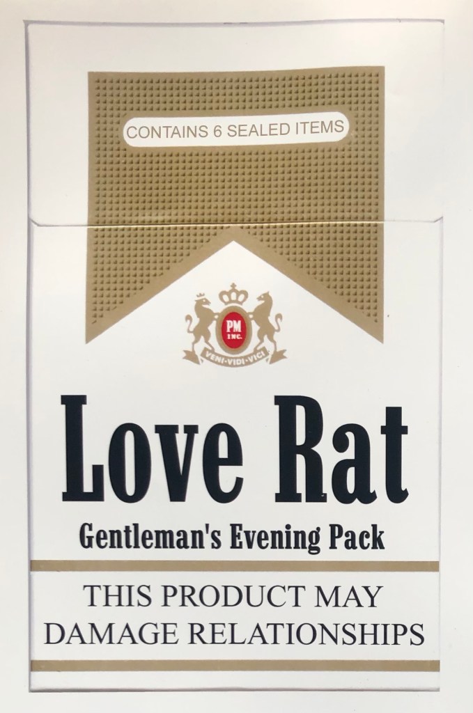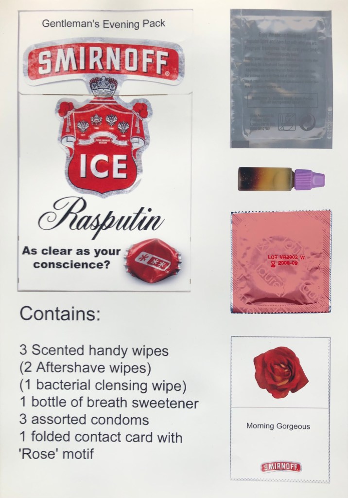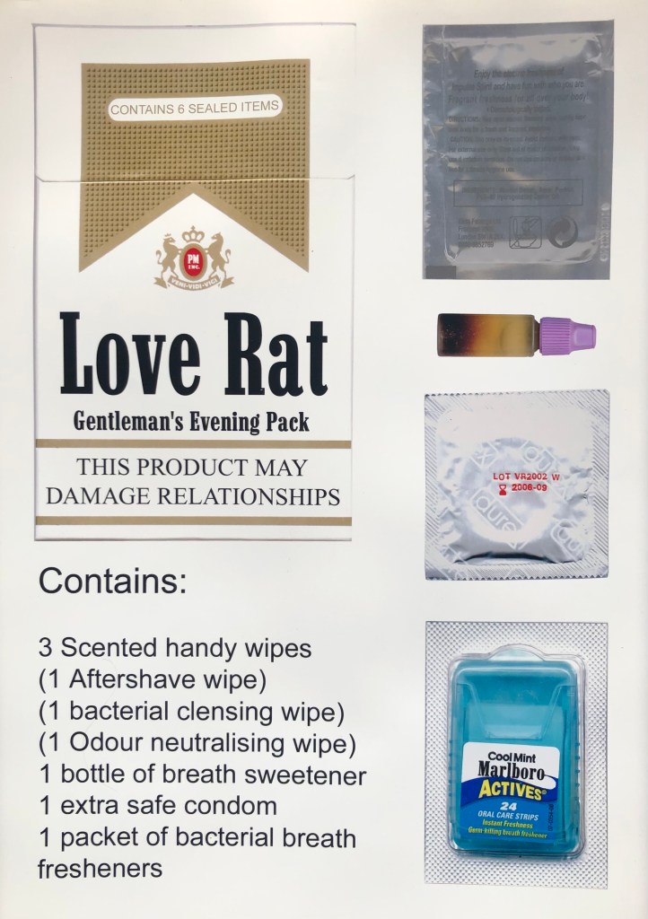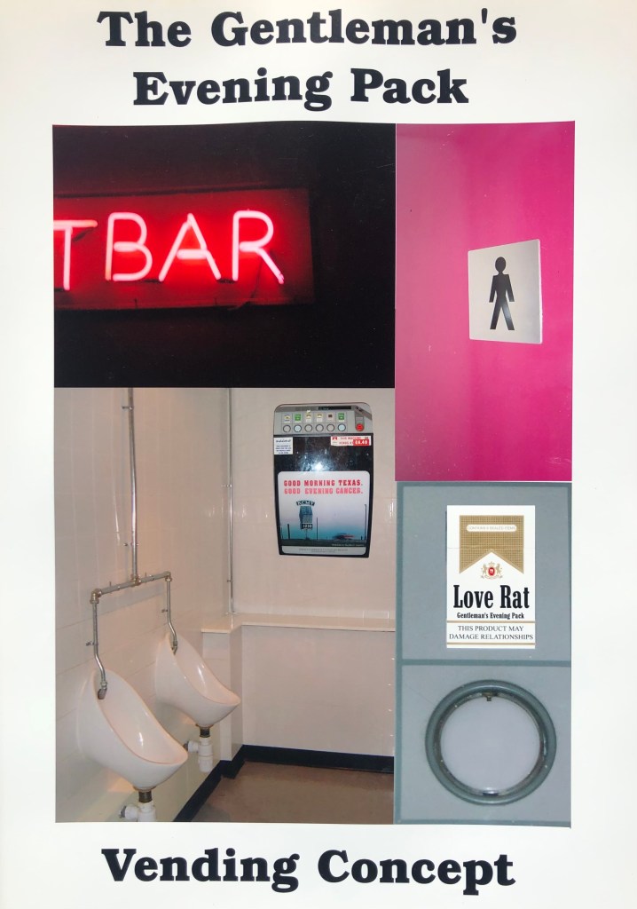 International Flavors and Fragrances (IFF) set a project all students on fashion courses to create “an innovative new fragrance”…This was my response. I repurposed vending machines that used to sell cigarettes in the toilets in bars and pubs after it had been made illegal to sell tobacco in these establishments. The idea was that men could acquire useful props in the pursuit of a potential, romanic encounter, in the privacy of the male restroom. Companies could collaborate were relevant and bring in marketing revenue for IFF.